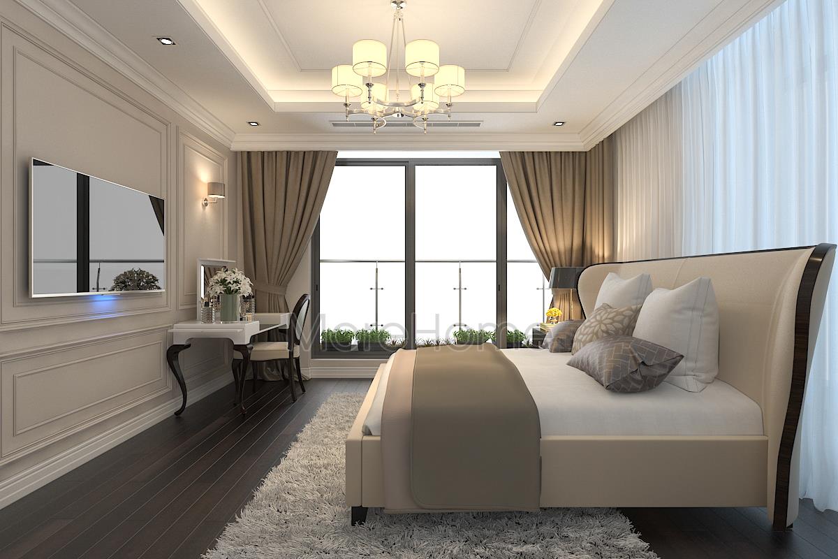 Phía đối diện chiếc giường ngủ chính là chiếc tivi treo tường và bàn trang điểm tân cổ điển cách điệu đẹp đến mê mẩn.