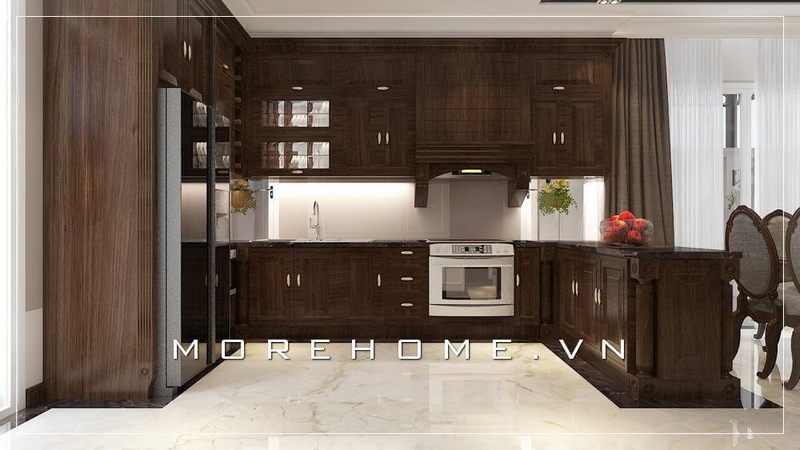 Thiết kế nội thất phòng bếp biệt thự gỗ tự nhiên sang trọng mang đến cảm giác ấm cúng và đẳng cấp cho ngôi nhà