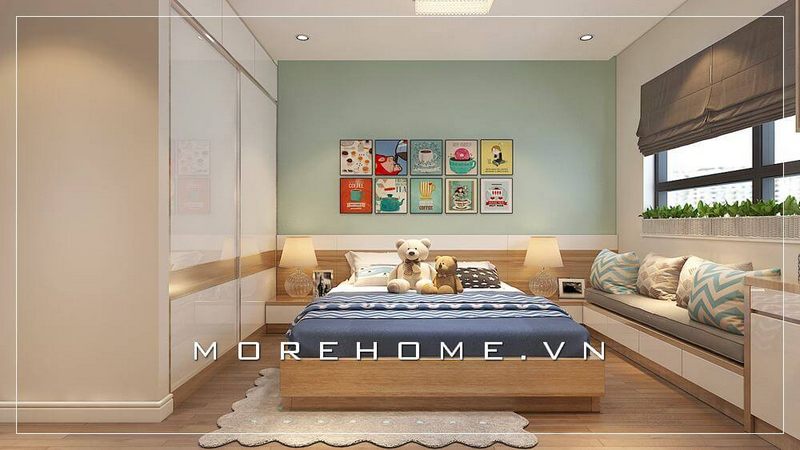 Trang trí nội thất phòng ngủ trẻ em đơn giản và tiện nghi, việc kết hợp giữa 2 màu sắc xanh - trắng chủ đạo tạo sự cuốn hút và thích thú